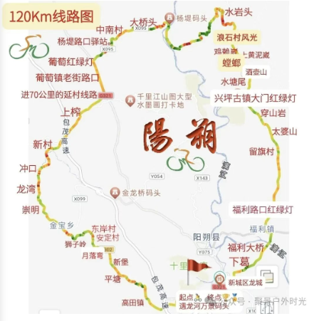 120公里线路起点:遇龙河万景码头(工农桥旁)开幕式出发路口安排人员守岗指引线路→高田镇,安排人员守岗指引线路→平塘→月落弯→东岸村→大桥村→狮子岭→金宝乡路口,安排人员守岗指引线路方向和补给矿泉水→崇明→冲口→新村→上榨→葡萄镇老街路口→葡萄镇街口红绿灯🚥安排人员守岗指引线路方向→杨堤路口驿站休息补矿泉水→中南村→大桥头→杨堤码头休息打卡,欣赏漓江精华山水的鲤鱼挂壁等景点,安排补矿泉水,按票领取中午快餐和粥,按船票过渡浪石村漓江风光,安排人员守岗指引线路方向→水岩头→浪石村漓江田园风光,骑行漓边途中欣赏童子拜观音和漓江精华山水段,穿越浪石百年古建筑村→鸡赖嵅→黄泥嵅,安排补矿泉水点→螳螂→酒壶山→水塘尾,安排人员守岗指引线路方向和指路牌,在三千漓设点休息,若是一些骑士在17:00骑行累了,统一在三千漓停留休息坐后勤车到终点站→兴坪古镇大门红绿灯🚥安排人员守岗指引回阳朔线路方向→穿山岩→太婆山→留旗村→福利镇路口红绿灯🚥安排人员守岗指引线路方向→福利大桥→下葛→高岩村十字路口安排人员守岗指引线路方向→凤凰山水上境红绿灯🚥安排人员守岗指引线路方向→龙口→进历村赏月路(注:月亮山观赏路可以观赏美丽的月亮山),历村路口大门安排人员指引线路去终点站方向→络点,万景码头。