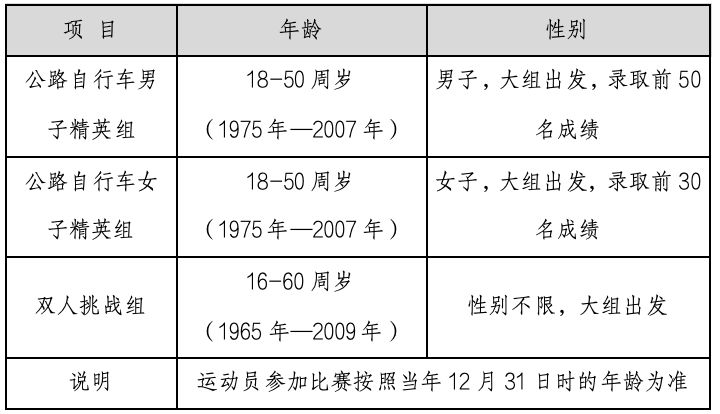 2、公路自行车男子/女子精英组要求:中国国藉(不含港澳台选手),持大陆身份证的广大自行车爱好者均可报名。