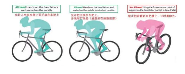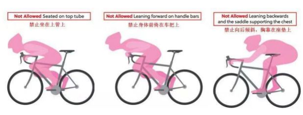 (十一)比赛中选手不得采取危险骑行姿势(如图)以及影响控车的骑行姿势,以避免出现安全隐患,危及自身及其他选手骑行安全。