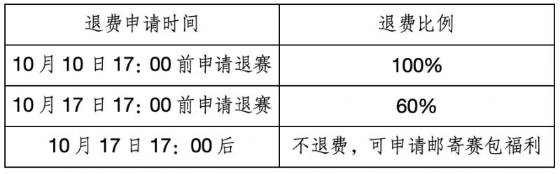 ··超出退费申请时间后,如无法参赛将不予退费,但可申请邮寄赛包福利,具体申请方式将在赛前公布,顺丰到付。