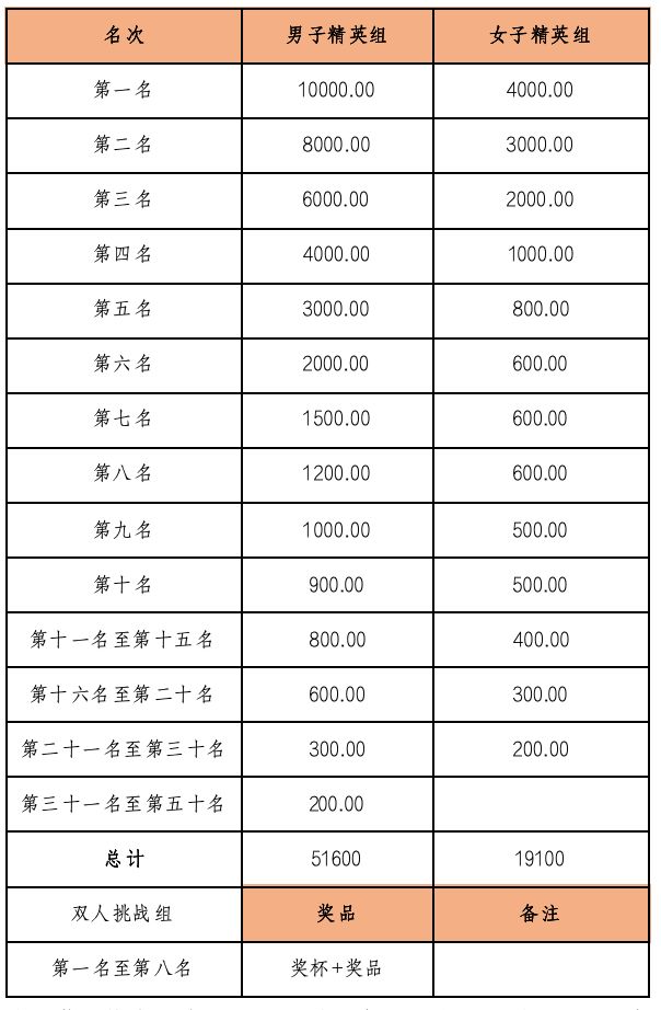 (一)男子精英组录取前50名、女子精英组录取前30名发放奖金;前8名参加颁奖仪式;外交官组录取前3名上台颁发奖品和奖杯;挑战双人组前8队参加颁奖仪式。