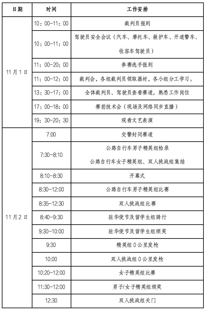 1.公路自行车男子精英组比赛所有运动员从起点出发荣誉骑行35KM后到达0公里后9:30统一开始比赛计时,按到达终点先后顺序录取名次,以主集团通过终点成绩时间的15%作为关门时间节点,关门之后不再记录赛事成绩,视为该组别竞赛结束。比赛关门前运动员禁止逆行赛道返程骑行。裁判团有权根据实际情况决定关门时间。