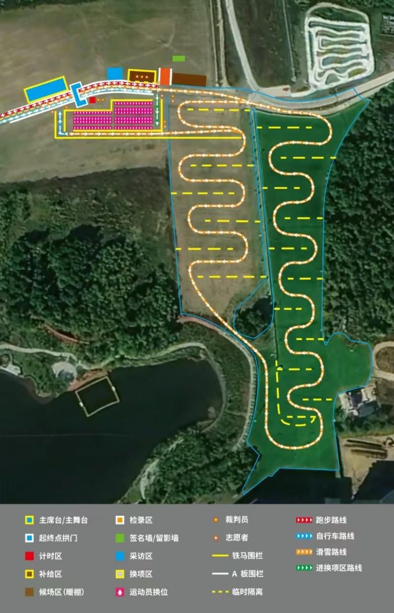 1.冬季铁人三项赛:顺序:跑步、自行车、越野滑雪。各项目间紧密衔接。(铁人三项赛与骑跑两项赛一起发枪)。