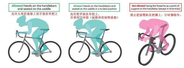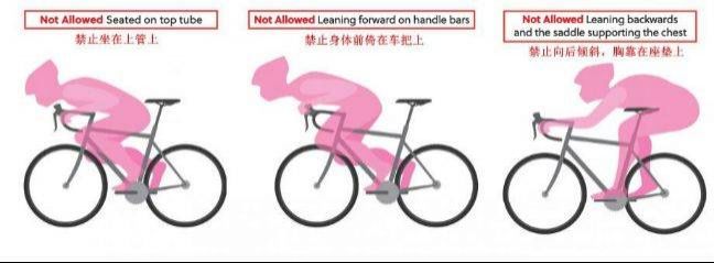 4、比赛中选手不得采取危险骑行姿势(如图)以及影响控车的骑行姿势,以避免出现安全隐患,危及自身及其他选手骑行安全。