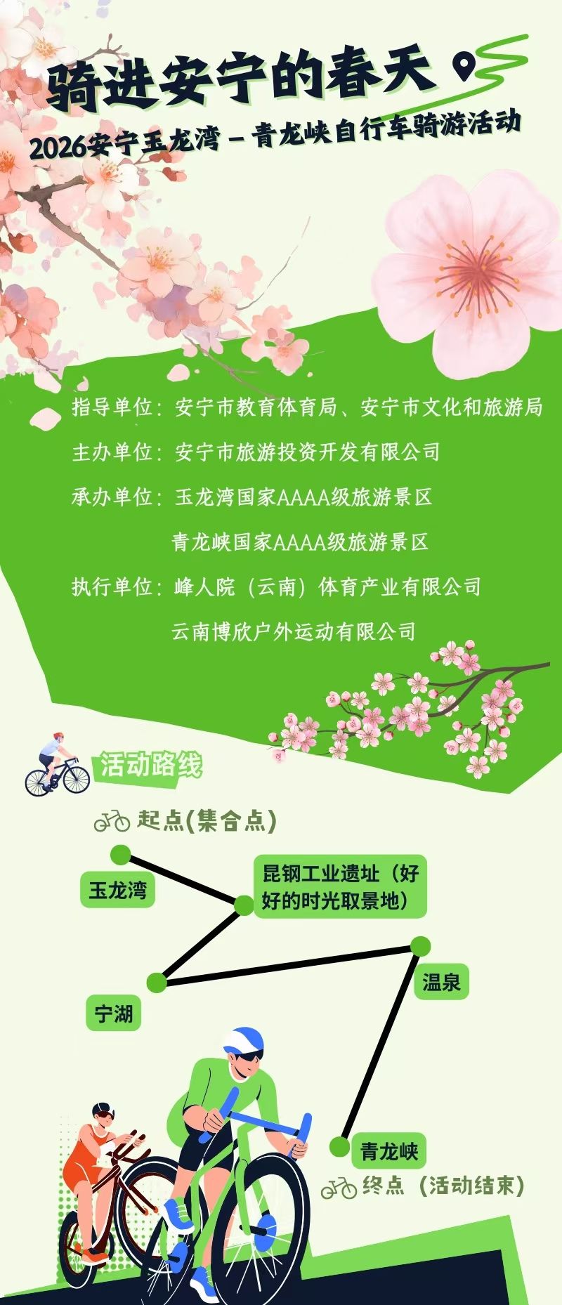 ▌赛程信息:全程约 58KM,线路【玉龙湾(起点)→金方(昆钢工业遗址《好好的时光》拍摄地)→连然(宁湖)→温泉(摩崖石刻、牧羊湖)→青龙(樱花道)→青龙峡(终点)】,可使用公路车参与。