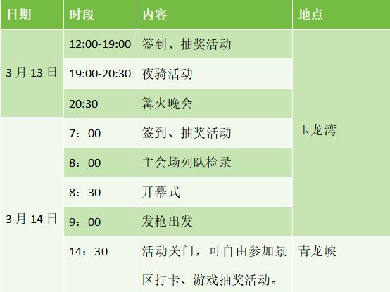 奇遇森林荧光夜骑:身披荧光装备,骑行于玉龙湾环湖赛道,在夜色中邂逅湖光美景,氛围感拉满;荧光夜骑后 忘野集营地篝火音乐派对:围坐篝火旁,听动感音乐,与骑友欢聚畅谈,解锁春日浪漫夜生活。