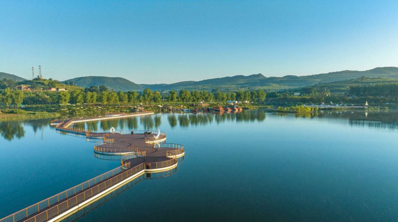 「高平市釜山康养休息区驿站」位于高平市寺庄镇,入选2025年山西省三个一号旅游公路沿线特色乡村驿站典型案例。釜山村依山傍水、风光旖旎,这里四面环山,村西泫水湖碧波荡漾,300年历史的千株老梨树自成特色,棋盘六院、宣圣庙等古建群落聚集。2021年7月,釜山村被确定为山西省文旅康养和乡村振兴融合发展先行示范村。借助太行一号旅游公路环线乡村振兴示范带建设的契机,釜山村依托村企联建模式,按照“保护、建设、运营”生态协同共进的原则,挖掘“绿水青山、红色工业、古建筑群”等特色资源。村中有赏花小道、观景平台和休闲露营地,古梨树主题生态公园,有划船、水秀、浮桥等水上设施,旅游公路、游客中心、环湖等配套设施完善。