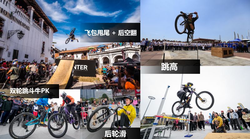 高阶节目:山地车飞包甩尾、后空翻边、双轮跳斗牛PK、跳高、后轮滑
