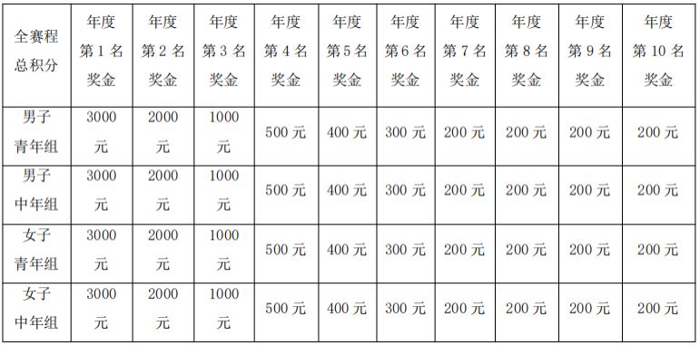 B、男子中年竞技组限报100名,终点名次奖励(年龄41-60周岁,前100名获得积分,前50名获得奖金、前3名同时获得组委会颁发的奖杯和证书)