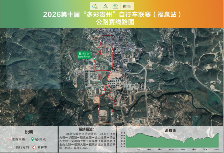 (一)公路赛线路概述:福泉古城文化旅游景区(起点)→南关街→华南路→新泉东路→金山北路→洒金谷大桥→金鸡山大桥→将军桥→葛镜西路→金山北路→福源大道→福泉古城文化旅游景区(终点)单圈8.8km。