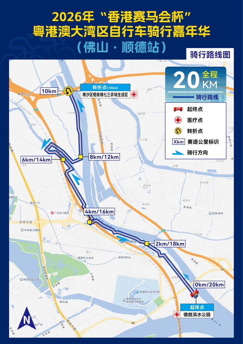 3.骑行路线:起点(德胜滨水公园)→兆利大街(北行)→农乐街路口(折返)→兆利大街(南行)→终点(德胜滨水公园)全程20公里;