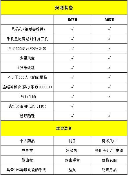50km组:参赛选手应需有以下参赛经历:5年内30公里(8小时内完成)及以上(含)越野赛或全程马拉松(4小时30分钟内完成,且需要越野赛参赛经验)或更长距离路跑赛、越野赛、耐力赛完赛经验。