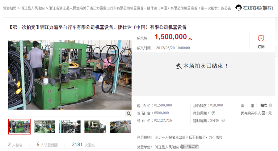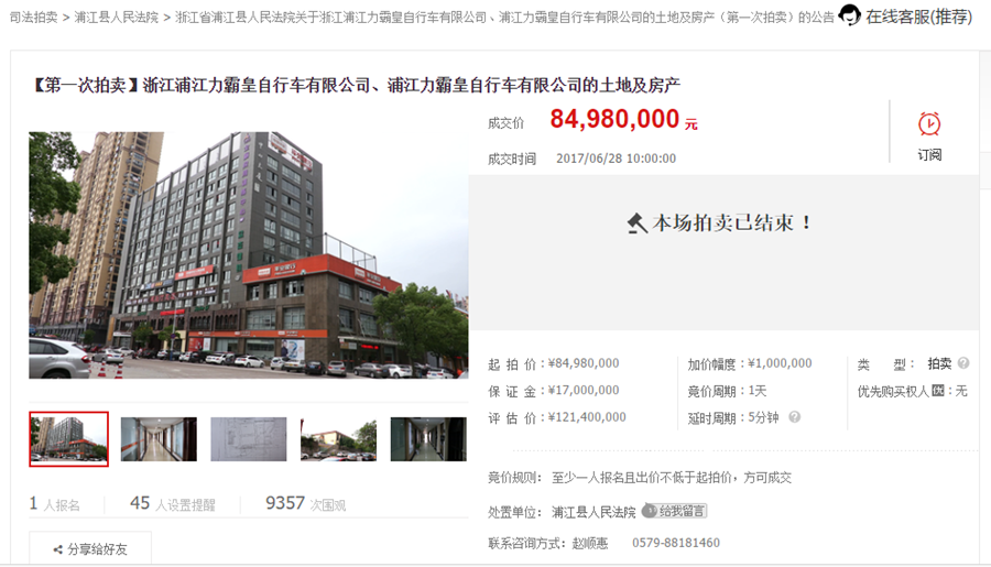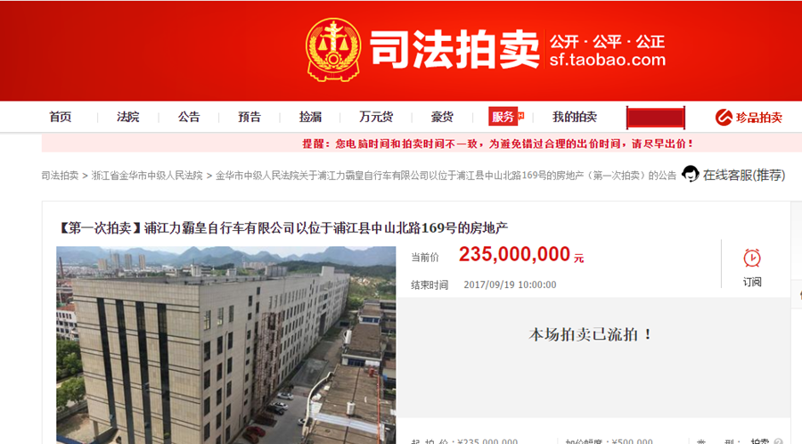 9月19日10时,在淘宝网司法拍卖网络平台上,金华市中级人民法院对浦江力霸皇自行车有限公司名下房地产的第一次公开拍卖结束。这已经是今年以来浦江力霸皇自行车有限公司的第三次固有资产拍卖了,标得物涉及土地、房产及工厂机器设备。