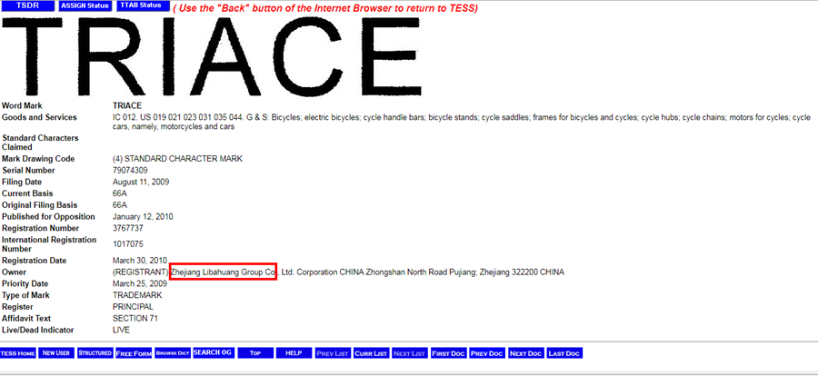 骓驰一直标榜来自美国,野途传媒记者从美国专利商标局(USPTO)查询得知,带有“TRIACE”字样的跟自行车有关的商标,总共有3件,其中一件仍然存续,2件已经过期。仍然存续的是“TRIACE”,注册范围涵盖自行车、自行车装备、电动车和汽车,商标拥有者为一家来自中国的名为“Zhejiang Libahuang Group Co. Ltd. Corporation”的公司(如下图),与浙江力霸皇工贸集团有限公司十分接近,而公司地址浙江浦江中山北路更是与浙江力霸皇工贸集团有限公司的总部地址吻合。