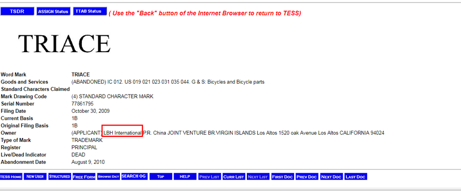 已经过期的两个商标中,只有英文“TRIACE”字样的商标,注册范围为自行车及自行车配件,商标拥有者是一家名为“LBH International”的公司(如下图),这与“LBH国际有限公司”非常接近,而后者,与浙江力霸皇工贸集团有限公司联合投资了浙江浦江力霸皇自行车有限公司。