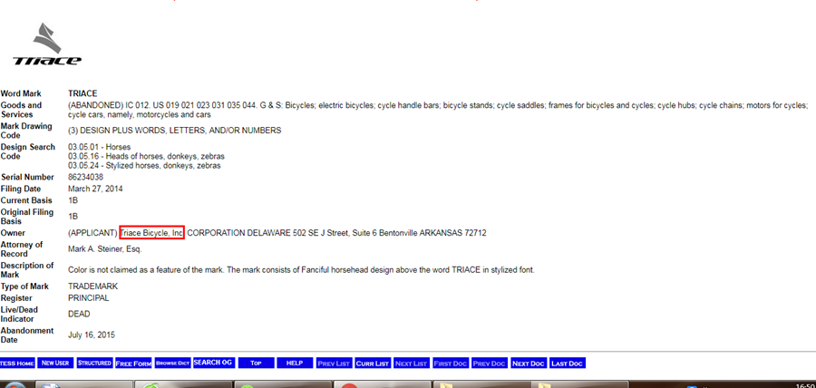 另一个已经过期的带有“TRIACE”英文字样和图片的商标,注册范围包括了自行车、自行车配件、自行车装备、电助力自行车、电动车和汽车,这个商标,与国内骓驰使用宣传的商标相同,商标拥有者是Triace Bicycle Inc,这是一家来自美国阿肯色州的公司(如下图),野途传媒未能查到更多关于这家公司的资料,也未能查到骓驰(上海)自行车有限公司的母公司TRIACE International Holding Company Limited的更多资料。不过值得注意的是,这个带有英文字母和图标的商标,2014年才在美国注册, 目前已经过期失效。