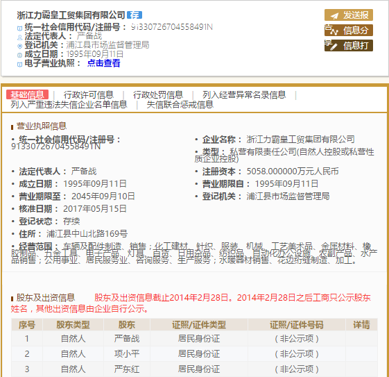 浙江力霸皇工贸集团有限公司法人代表严备战,股东一栏有严东红名字