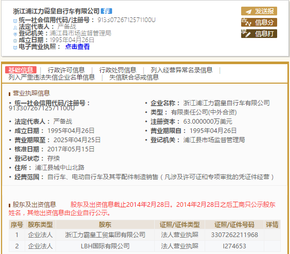 浙江浦江力霸皇自行车有限公司的工商股东分别为浙江力霸皇工贸集团有限公司和LBH国际有限公司