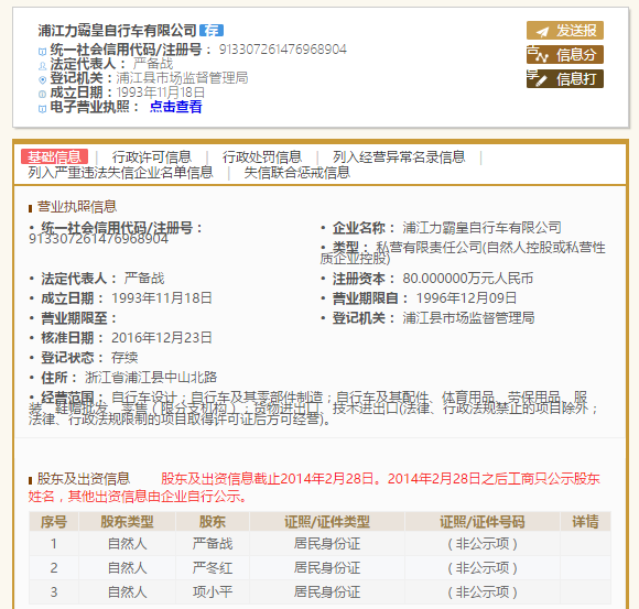 野途传媒记者通过“国家企业信用信息公示系统”查询得知,此前被拍卖过财产的浦江力霸皇自行车有限公司和浙江浦江力霸皇自行车有限公司,都与浙江力霸皇工贸集团有限公司有关,其中,浙江浦江力霸皇自行车有限公司是浙江力霸皇工贸集团有限公司联合LBH国际有限公司投资的,而浦江力霸皇自行车有限公司登记在册的三名股东为严备战、项小平和严冬红,与浙江力霸皇工贸集团有限公司的股东结构几乎吻合,只是其中一名股东是严东红,略有出入(是否录入有误未得知)。