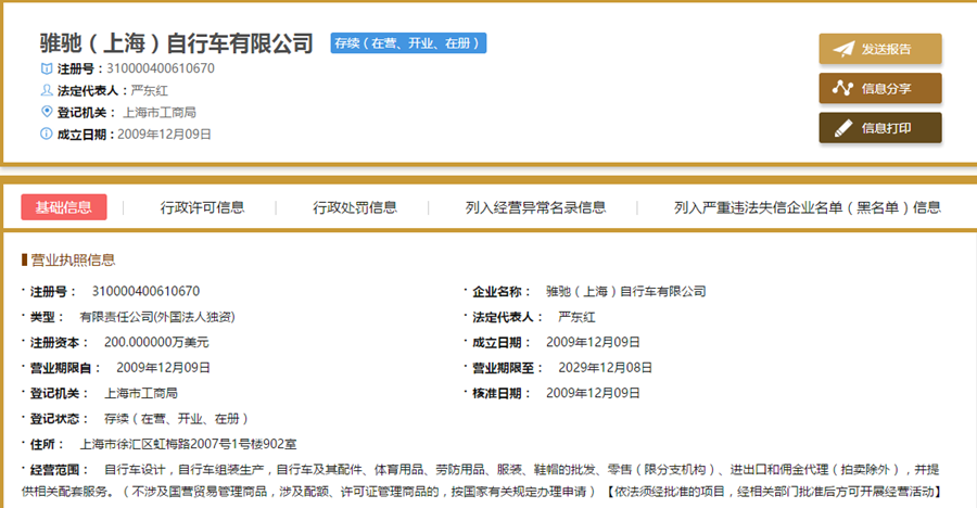 根据骓驰官网的介绍,TRIACE(骓驰)中国区总部——骓驰(上海)自行车有限公司,是TRIACE International Holding Company Limited在中国设立的全资子公司,这家公司官网上公布的公司总经理,正是力霸皇系列公司的法人代表严备战。通过“国家企业信用信息公示系统”查询,骓驰(上海)自行车有限公司的法人代表为严东红,也是浙江力霸皇工贸集团有限公司的股东。