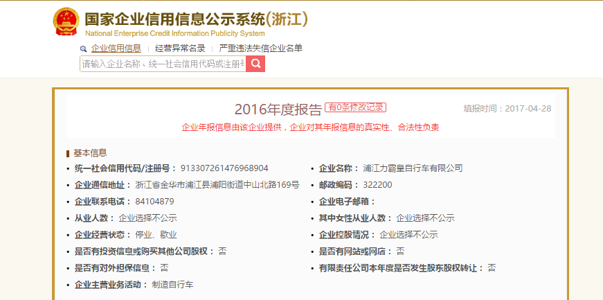 浦江力霸皇自行车有限公司去年已经停业