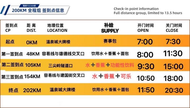 6) 建议所有参赛选手将手机、码表、照明装备等设备充足电,适当自备电池、创可贴等应急物料。