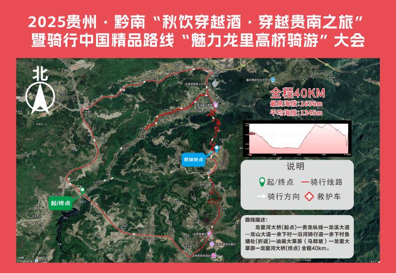 龙里河大桥(起点)一贵龙纵线一龙溪大道—龙山大道一余下村一沿河骑行道一余下村鱼塘处(折返)一油画大草原(马郎坡)一龙里大草原一龙里河大桥(终点)全程40KM。