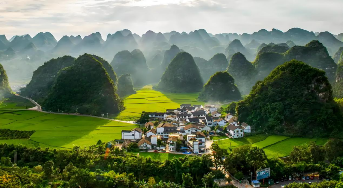 万峰林 - “高原上的心跳”。成千上万的喀斯特山峰绵延不绝,山下是八卦状的田园村庄,春季油菜花海,秋季稻浪金黄,宛如巨幅油画。