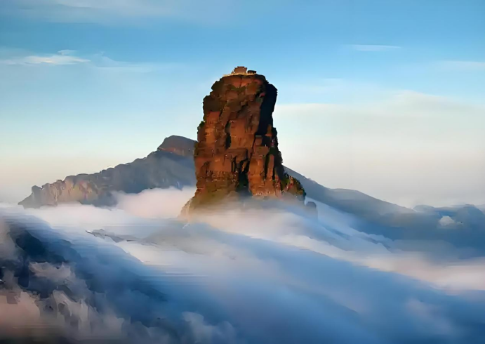 梵净山 - “天空之城”。云雾缭绕中,突兀而起的红云金顶和古老的蘑菇石,仿佛一座悬浮于空中的仙境,是自然与信仰的完美结合。