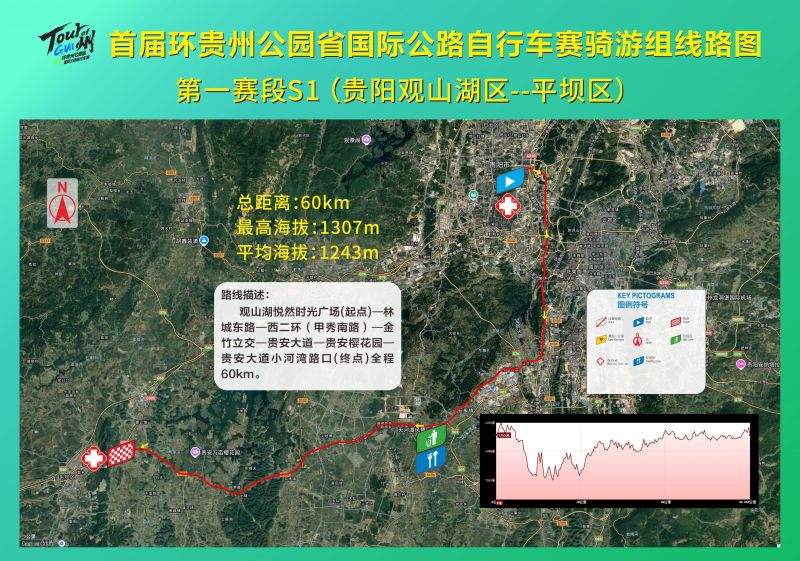 S1骑游组路线:长岭北路悦然时光(起点)一林城东路一西二环(甲秀南路)一金竹立交一贵安大道一贵安樱花园一贵安大道小河湾路口(终点)全程60km。