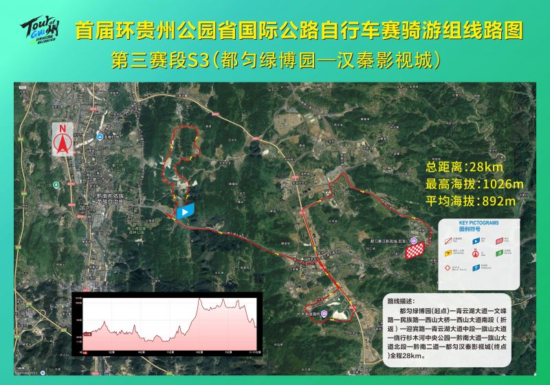 S3骑游组路线:都匀绿博园(起点)一青云湖大道一文峰路一民族路—西山大桥—西山大道南段(折返)—迎宾路—青云湖大道中段—旗山大道—绕行杉木河中央公园—黔南大道—旗山大道北段—黔南二道—都匀汉秦影视城(终点),全程28km。