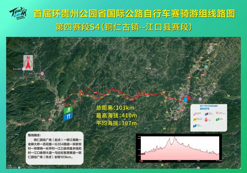 S4骑游组路线:铜仁团结广场(起点)—锦江南路—金鳞大桥—百花路—G354国道—宋家坝村—坝黄镇—长坪村—江口县坝盘乡挂扣村—江口象狮大道—马拉松智慧赛道—铜仁团结广场(终点),全程103km。