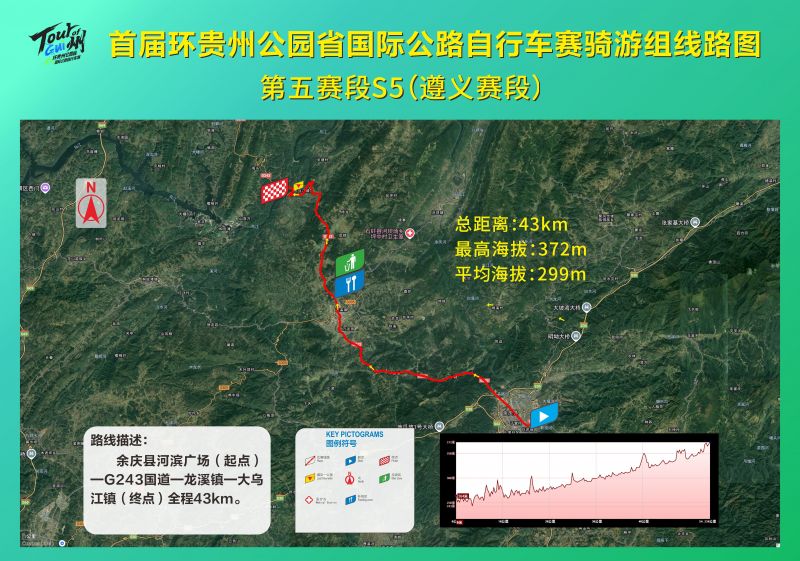 S5骑游组路线:余庆县河滨广场(起点)→G243国道→龙溪镇→大乌江镇(终点)全程43km。