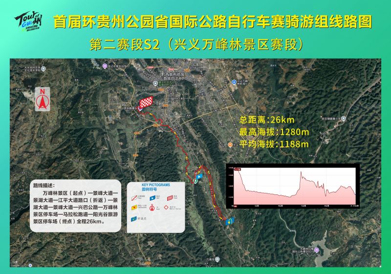 S2骑游组路线:万峰林景区(起点)一景峰大道一景湖大道一江平大道路口(折返)一景湖大道一景峰大道一兴巴公路一万峰林景区停车场一马拉松跑道一阳光谷旅游景区停车场(终点)全程26km。