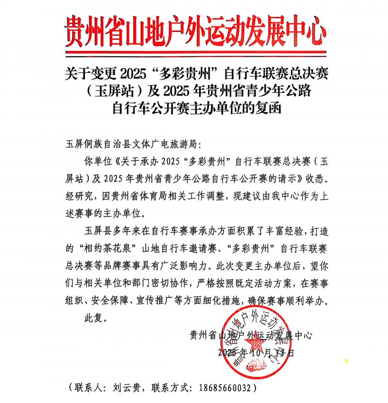 关于变更2025“多彩贵州”自行车联赛总决赛(玉屏站)及2025年青少年公路自行车贵州