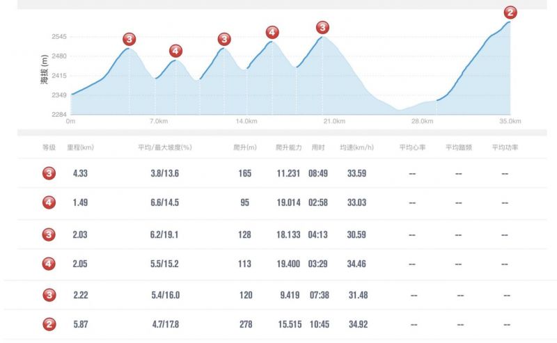 上坡16.84km(48.11%),平路4.51km(12.88%),下坡11.76km(33.59%),坡度范围-20%~18%