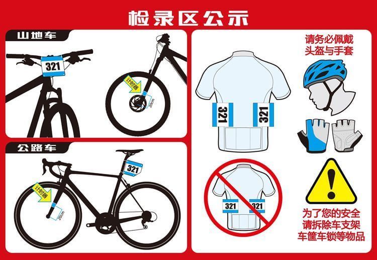 参赛运动员和车辆须按规定佩戴组委会统一配发的号码布、车架牌和计时芯片,赛前由本人领取,竞赛时参赛队员必须将自己号码布、车架牌、计时芯片按照佩戴示意图固定在指定的位置,不得裁剪,不得互换,否则,取消比赛资格。