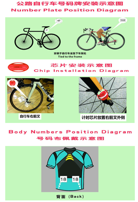 5、号码布及车牌号:运动员须按照规则规定,分别佩戴在背部靠下部位,及自行车座管上(见附件二)。号码布及车牌号严禁裁剪或折叠,否则将给予该运动员相应处罚。