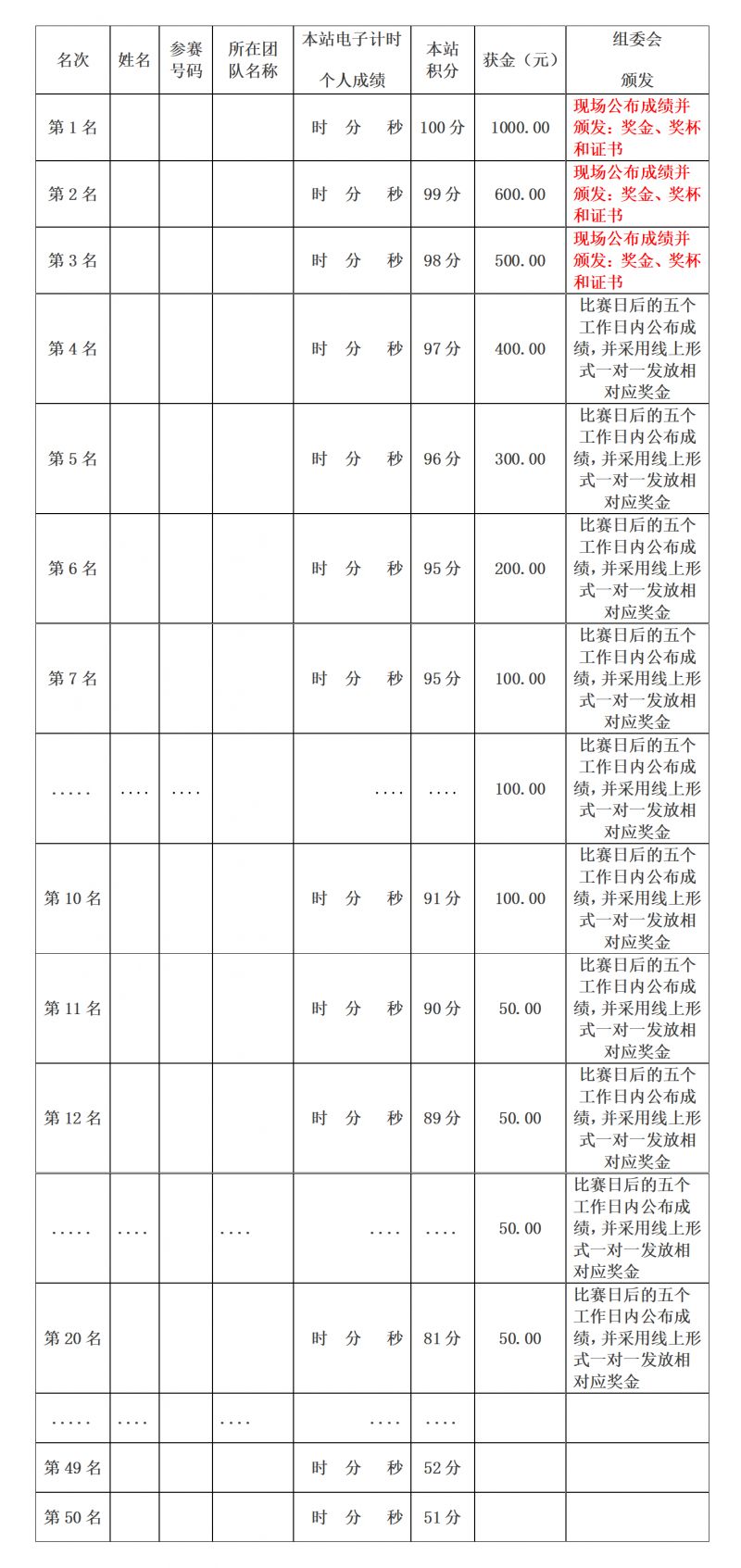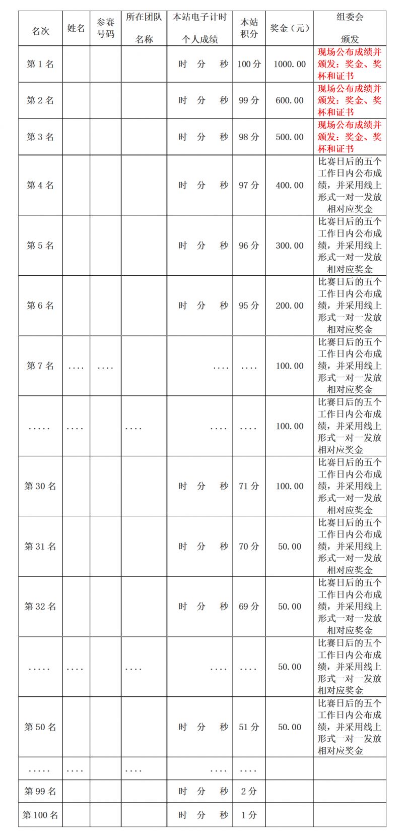 (二)本站赛事竞技组各组别设置名次奖金,其中分别获得四个组别前三名的车友,组委会在比赛终点现场公布本站赛事的电子计时成绩,并在终点现场参加颁奖仪式,领取奖金。