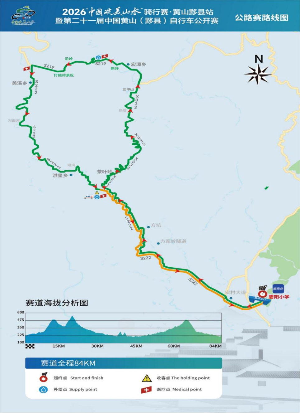 公路赛起终点为碧阳小学,经宏村大道、五里转盘、方家岭隧道,右转进入X033、沿茶叶岭、S219、宏潭乡、打鼓岭景区再回到S222,经美溪乡、洪星乡后原路返回碧阳小学。赛道全程约84KM。