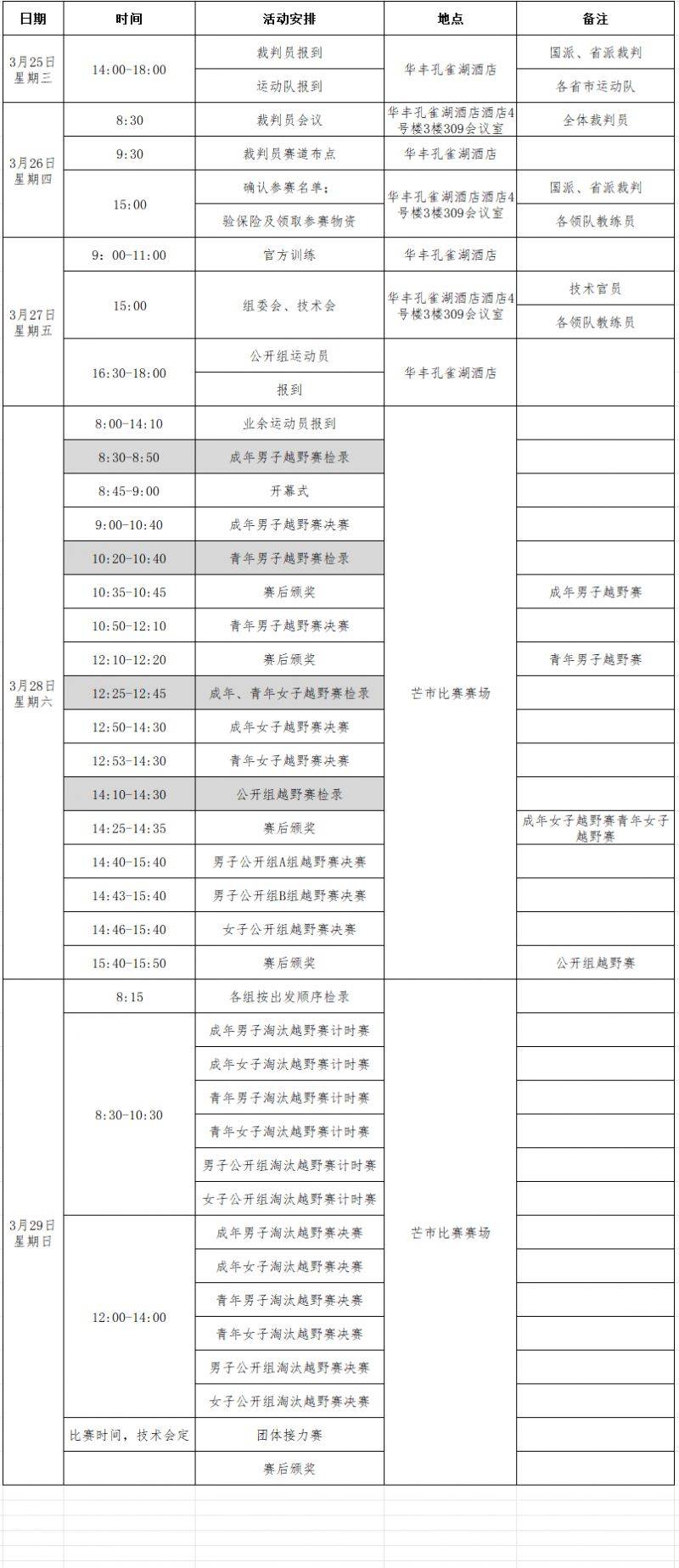 备注3:团体接力赛以省为代表队组队;公开组运动员可和各省联合组队,也可自由组混合队,但服装必须一致。