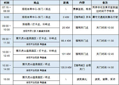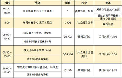赛事路线:【洛阳体育中心-东门/起点】→(右转)王城大道/ S243→ 李屯特大桥 →S252→ 洛伊快速路 →(滨河大道交接口,左转,注意安全)S238→ 草店伊河大桥 →S238→ 洛临路/ S238→【洛临路/打卡点、补给点】→ 洛临路/ S238→S238→(右转)汝安路→(右转)酒祖大道 →(左转)S243→ 汝白路/ S243→(左转,注意安全)汝白路→(右转)… →【雅文虎山温泉园区/终点】