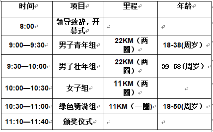 比赛分组:男子青年组、男子壮年组、女子组、绿色骑游组四个组别,报名不足20人则取消该组别。各组限报100名。
