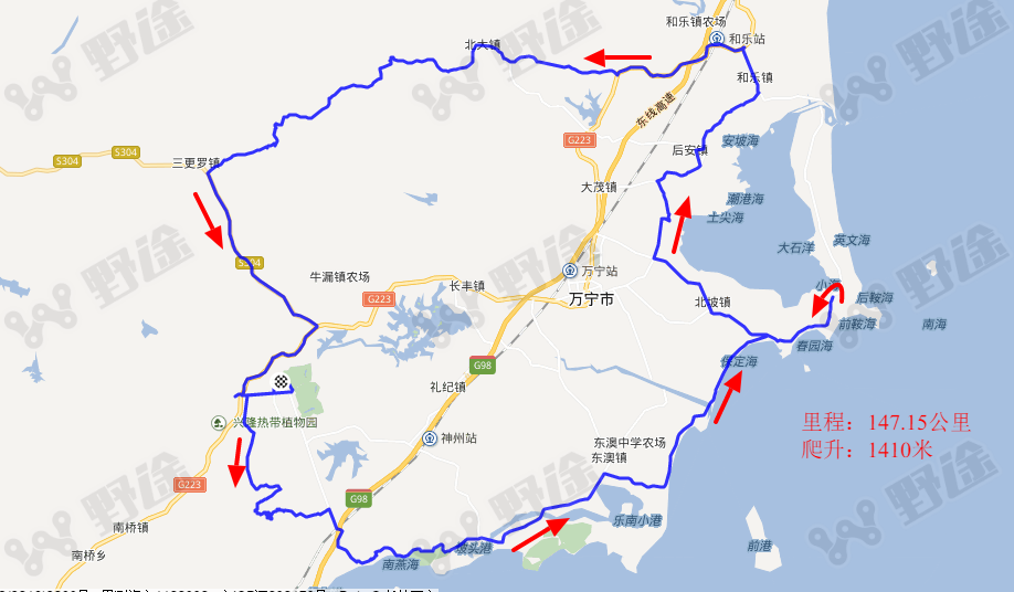 兴隆月亮河广场(起点)——康乐路——温泉大道——天健大道——兴隆侨乡驿站——兴隆热带花园——兴梅大道——海田路(石梅湾艾美度假酒店,二签30公里)——保利半岛一号路口——县道X435(三签44公里)——海岸景观大道——乌场——联丰村(折返点,四签58.7公里)——乌场——县道X432——东山岭——乡道——旧州村——县道X426——后安镇——和乐镇(五签85公里)——G223——村道——北大镇(六签101公里)——北大乡农场——S304——三更罗镇(七签128公里)——S304——牛漏——G223/三亚方向——太阳河大桥——温泉大道——康乐路——兴隆月亮河广场(终点147公里)