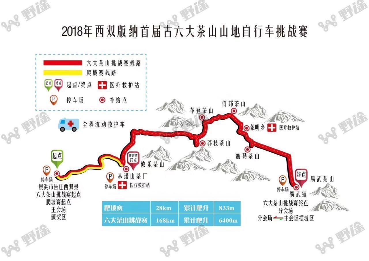 (二)古六大茶山挑战赛赛道:赛道融古六大茶山自然风光和版纳民族风情于一体,极具挑战难度。全程168公里,为柏油路面、水泥路面、土路、碎石路、山寨乡村路和茶山林道。最高海拔1564米,最低海拔488米,累计爬升6645米,累计下降5294米,坡度-15%—20%。