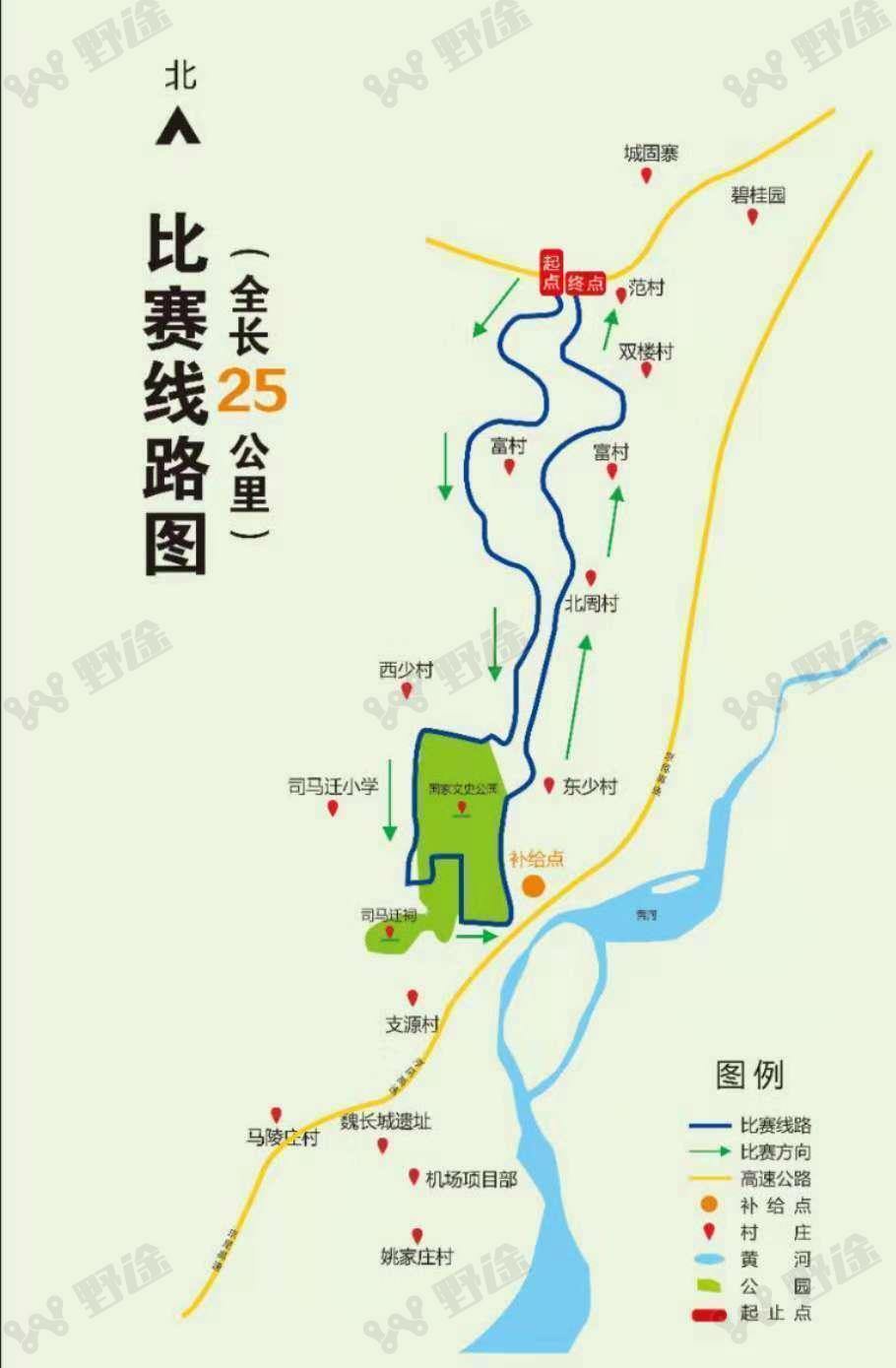 赛道全长约25 公里,线路为:澽水河1号码头→河堤西路入口→汉唐路桥(右拐)→司马迁祠广场路口(左转)→文史公园东路→东少村(左转)→河堤东路(终点)。