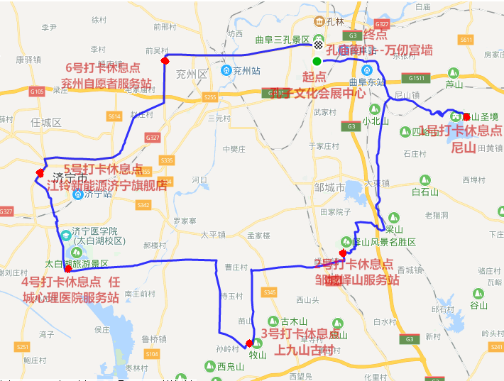 【路线】起点设置在曲阜孔子会展中心--大成路--滨河路--弘道路--滨河观光大道--尼山新修路----尼山(1号打卡休息点)--尼山新修路--滨河观光大道--邹城新东外环--邹城峄山服务站(2号打卡休息点)--临荷路--兴北路--上九山古村(3号打卡休息点)--太黄线--郭里--兴港路--临荷路(南二环)--太白湖--京杭运河特大桥东任城心理医院自愿者服务站(4号打卡休息点)--滨河路--济宁西环立交--105国道--江铃新能源济宁旗舰店(5号打卡休息点)--105国道--任城大道(S338省道)--S104省道--(104省道第一加油站)兖州自愿者服务站(6号打卡休息点)--北环城路--(327国道),最后集大成通过神马道到达终点--曲阜孔庙正门(万仞宫墙前)。
