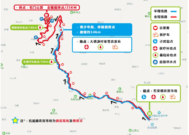 石梁镇过境大道农贸市场→花木线→黄大线→黄茶村路口→小沟村→童前村→半源村→大俱源村老雪农家乐(14公里组终点)→上社→梅树底→石门山(25公里组终点)