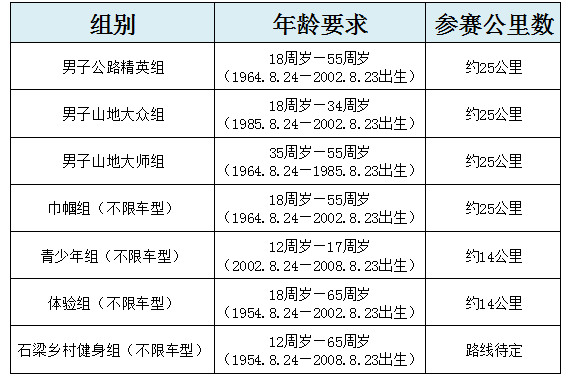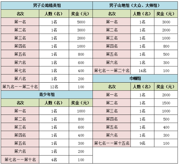 竞赛组(男子公路精英组、男子山地大众组、男子山地大师组、巾帼组、青少年组):60元/人
